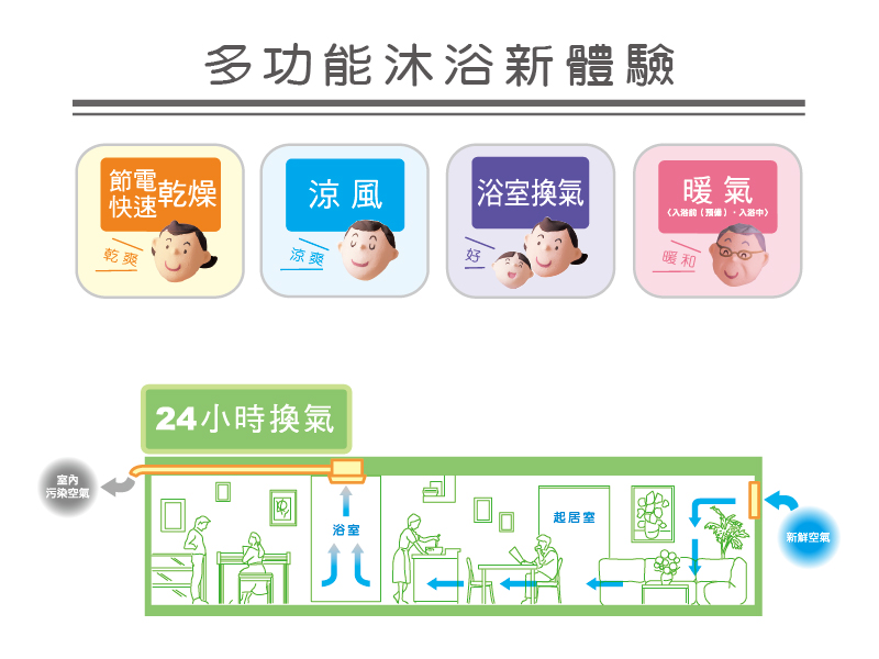 更重要的是,無論密閉無窗或是有窗的浴室,一般會因為避免灰塵或是外面太過吵鬧或是覺得不方便開啟窗戶,此時,浴室會呈現不通風狀態,暖風機24小時則是一個好幫手,隨時保持浴室空氣清新通風。