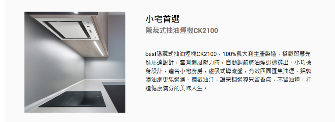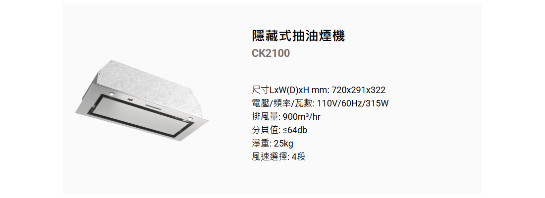 隱藏式抽油煙機CK2100商品描述:排風降噪尖端靜音技術省電延遲關機自動排風功能高亮度LED照明裝置易清可拆式高吸附濾網商檢登錄字號:31228
