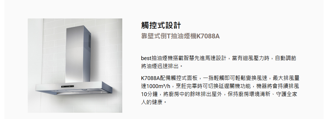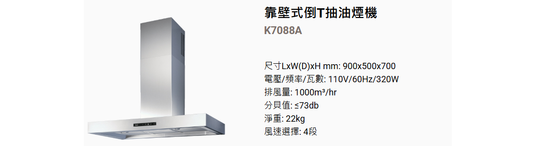靠壁式倒T抽油煙機K7088A商品描述:排風降噪尖端靜音技術省電延遲關機自動排風功能觸控式操作面板多機能照明裝置易清可拆式高吸附濾網搭配不鏽鋼油杯 使用更安心商檢登錄字號:31228
