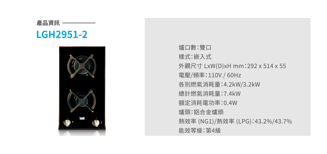 黑玻不鏽鋼外框雙口高效能瓦斯爐LGH2951-2商品描述:熱效能高 多段式火力隨心所欲瓦斯自動偵測切斷裝置法國EuroKera頂級陶瓷玻璃義式工藝美學 完美線條簡約時尚嵌入式平面設計符合人體工學商檢登錄字號:31228