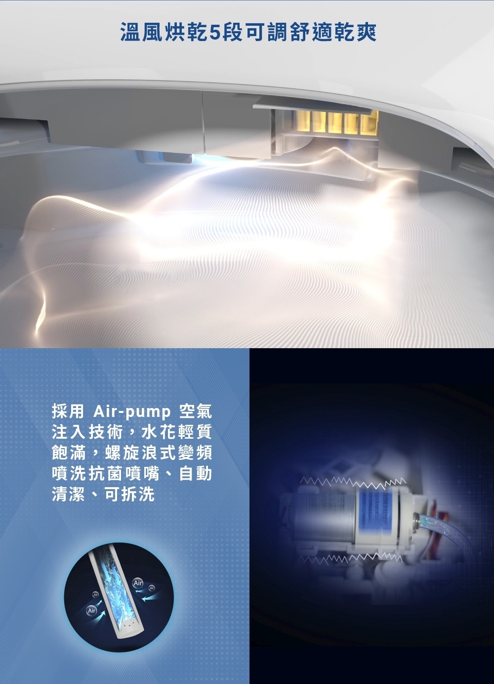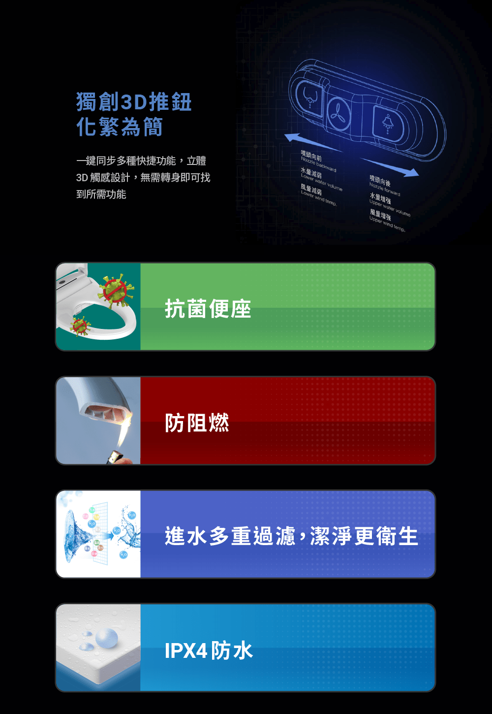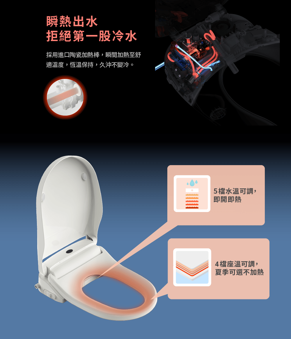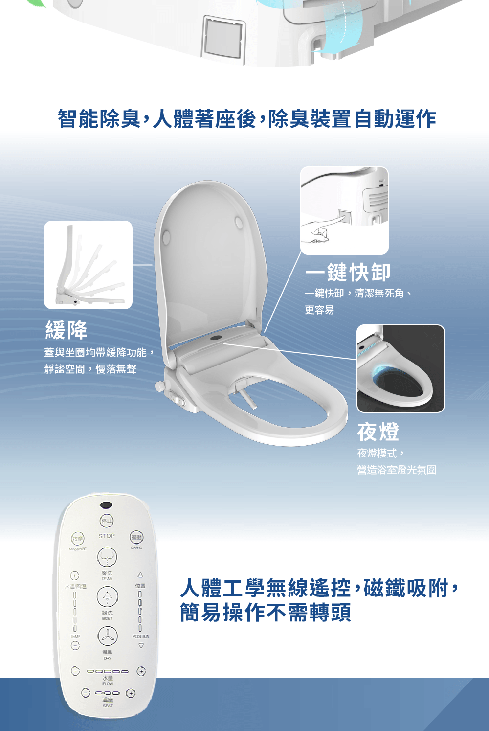 - 5段烘乾/智慧除臭/3D按鈕/夜燈/人座感應/緩降蓋板